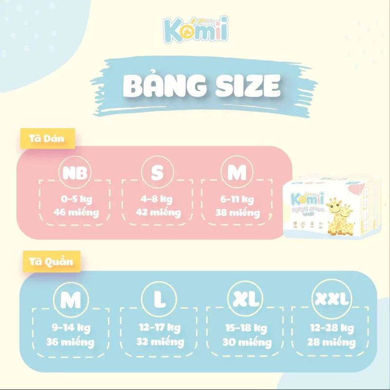 - Kiểm tra và thay tã: Nên thay tã cho bé sau khoảng 3-4 giờ hoặc ngay khi bé đi tiểu bẩn để đảm bảo vệ sinh và sự thoải mái cho bé. (Lưu ý: Mô tả sản phẩm Komii không đề cập đến vạch báo đầy).