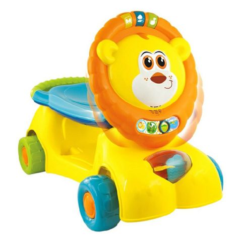 Bé có thể ngồi lên xe, tập đứng, đi bộ hoặc đẩy con sư tử giúp phát triển cân bằng.
